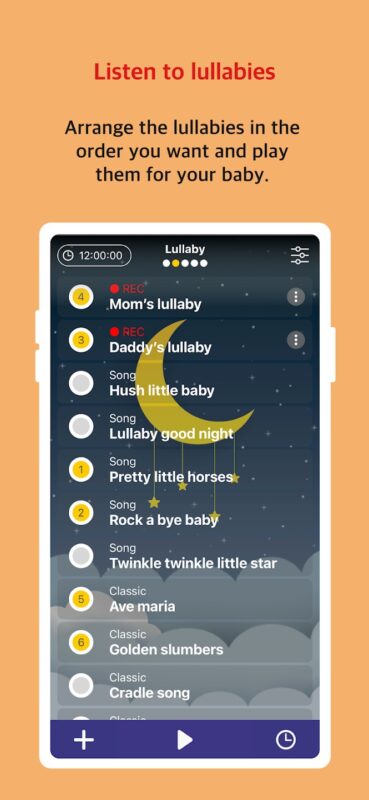 Aplikace pro klidný spánek dětí s bílým šumem a ukolébavkami.