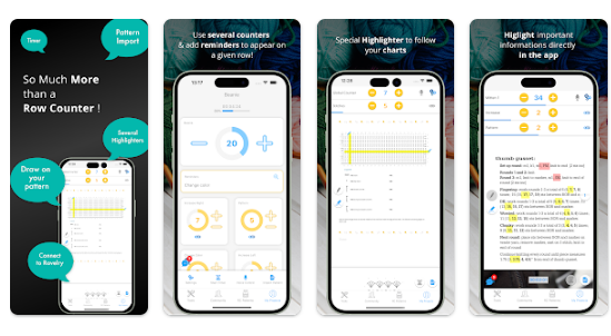 Hlavní předností aplikace je přizpůsobitelné počítadlo řádků, které můžete nastavit podle svých potřeb. Sledujte současně několik počitadel pro různé části vašeho projektu – ať už jde o přidávání ok, změny v designu nebo přechody mezi barvami. Díky této funkci budete mít vždy přehled o tom, kde přesně se ve vzoru nacházíte.