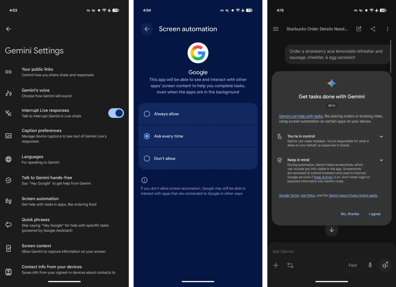 Gemini provádí většinu kroků, ale konečné schválení a platba vždy vyžadují váš zásah, což vám dává kontrolu. Během automatizace jsou pořizovány snímky obrazovky, které mohou být recenzovány pro zlepšení služeb, pokud máte zapnutou funkci „Zachovat aktivitu“.