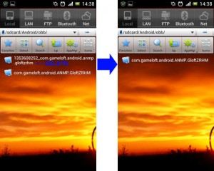 - Otevřete složku „obb“, tam kde jste extrahovali veškeré soubory. Měla by tady být složka něco jako „_com.gameloft.android.anmp.gloftzrhm“ s podsložkou „com.gameloft.android.anmp.gloftzrhm“. Tuto podsložku přesuňte do složky „obb“ a smažte celou složku „com.gameloft.android.anmp.gloftzrhm“ tu, ve které se nacházela právě tato podsložka. Obrázek níže vám ukáže…