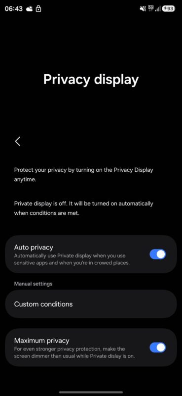 Samsung využívá speciální polarizační vrstvu displeje, která automaticky reguluje viditelnost. Uživatel si bude moci nastavit úroveň soukromí – například plný režim ochrany nebo jen mírné omezení. Tím se kombinuje pohodlné používání s vysokou mírou zabezpečení.