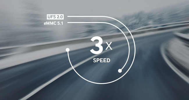 UFS dokáže mnohem lepší přenosovou rychlost. Tím pádem budete na veškeré úkoly čekat mnohem kratší dobu. Samsung UFS 2.0 dokáže poskytnout třikrát rychlejší čtecí rychlost, než eMMC 5.1.