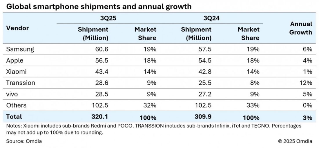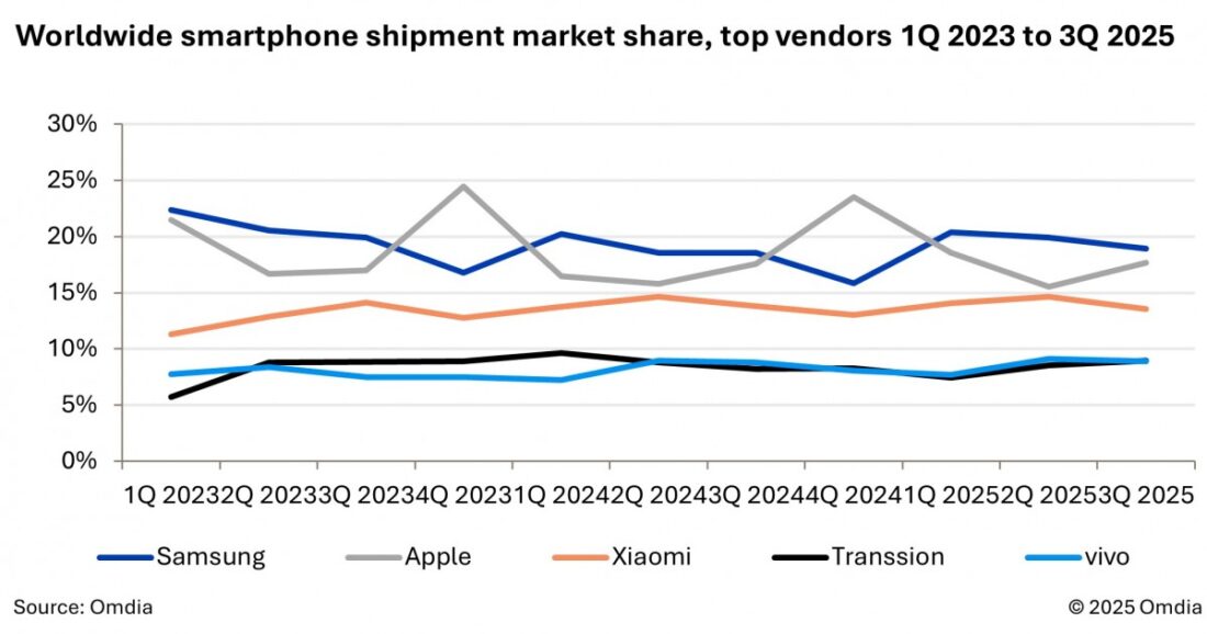 Samsung se stal lídrem trhu se smartphony ve 3. čtvrtletí 2025 s 19% podílem. Apple těsně druhý, nejrychleji rostl Transsion díky úspěchu v Africe.